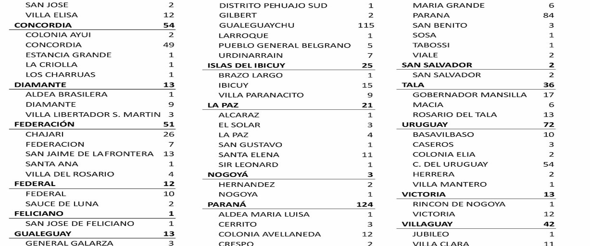 Departamento Colón 26, Departamento Concordia 54, distribuidos en: Colonia Ayuí 2, Concordia 49, Estancia Grande 1, La Criolla 1, Los Charruas 1; Departamento Diamante 13, Departamento Federación 51, Departamento Federal 12, Departamento Feliciano 1, Departamento Gualeguay 13, Departamento Gualeguaychú 133, Departamento Islas del Ibicuy 25, Departamento La Paz 21, Departamento Nogoyá 3, Departamento Paraná 124, Departamento San Salvador 2, Departamento Tala 36, Departamento Uruguay 72, Departamento Victoria 13, Departamento Villaguay 42. De ese modo, en la provincia son 119.076 los casos confirmados.