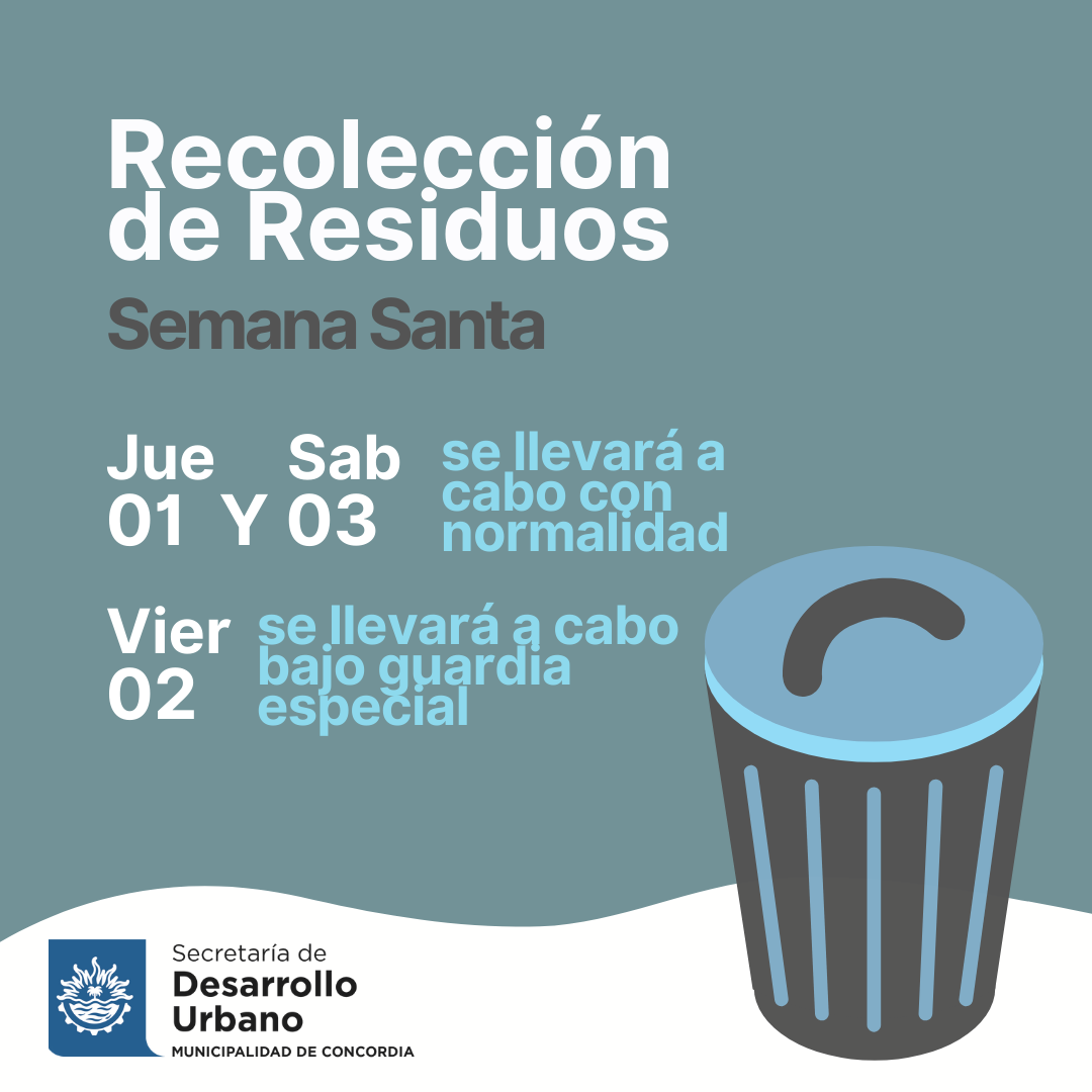Servicio de recolección de residuos durante Semana SantaLa Secretaría de Desarrollo Urbano de la Municipalidad de Concordia informó que el servicio de recolección de residuos domiciliarios durante Semana Santa en la ciudad funcionará el jueves 1° de abril, con normalidad en sus horarios y recorridos habituales.