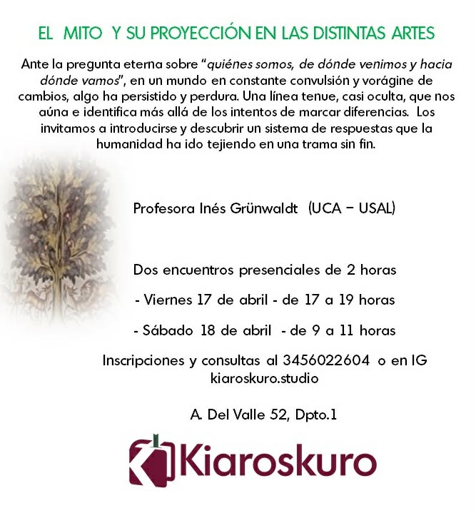 La propuesta aborda el mito como una herramienta fundamental para comprender las manifestaciones culturales a lo largo de la historia, explorando su permanencia en el arte, la literatura y el pensamiento humano. A partir de conceptos como estructura, funciones, símbolos, arquetipos y su relación con la psiquis individual y universal, el curso propone una mirada profunda sobre los interrogantes esenciales de la humanidad: quiénes somos, de dónde venimos y hacia dónde vamos.