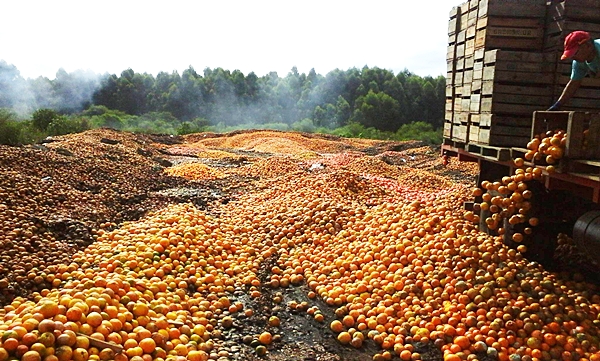 El Área de Producción del Municipio de Villa del Rosario, dispuso un sector especial en la Planta de Tratamiento de Residuos de esa localidad, donde los productores -solo entre el jueves 5 y viernes 6 de febrero- habrían volcado unos 330 “bines” (grandes cajones) de naranja de la variedad “Valencia Late”. De acuerdo a lo que apunto un productor a www.diarioriouruguay.com.ar, cada bin carga cerca de 400 kilos de fruta, por lo que se estima que más de 132.000 kilos de citrus fueron desechados como residuos.
