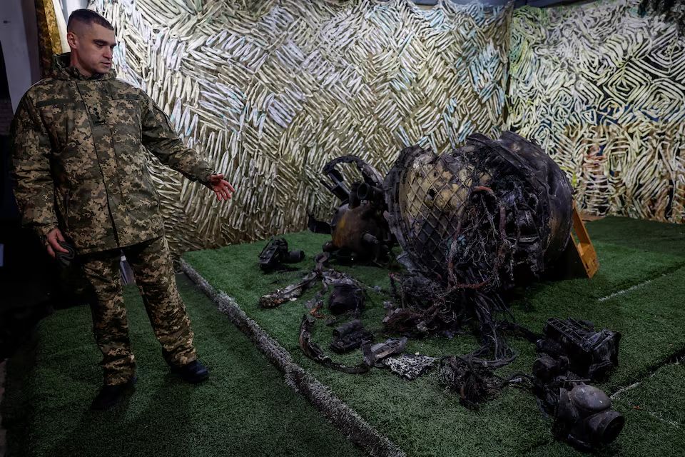 Los restos chamuscados y desmenuzados se colocaron en un hangar en una instalación que realiza análisis forenses de armas. Los expertos ucranianos estudian estos restos para obtener información sobre las cadenas de suministro y la producción militar rusa y cómo desarrollar contramedidas.