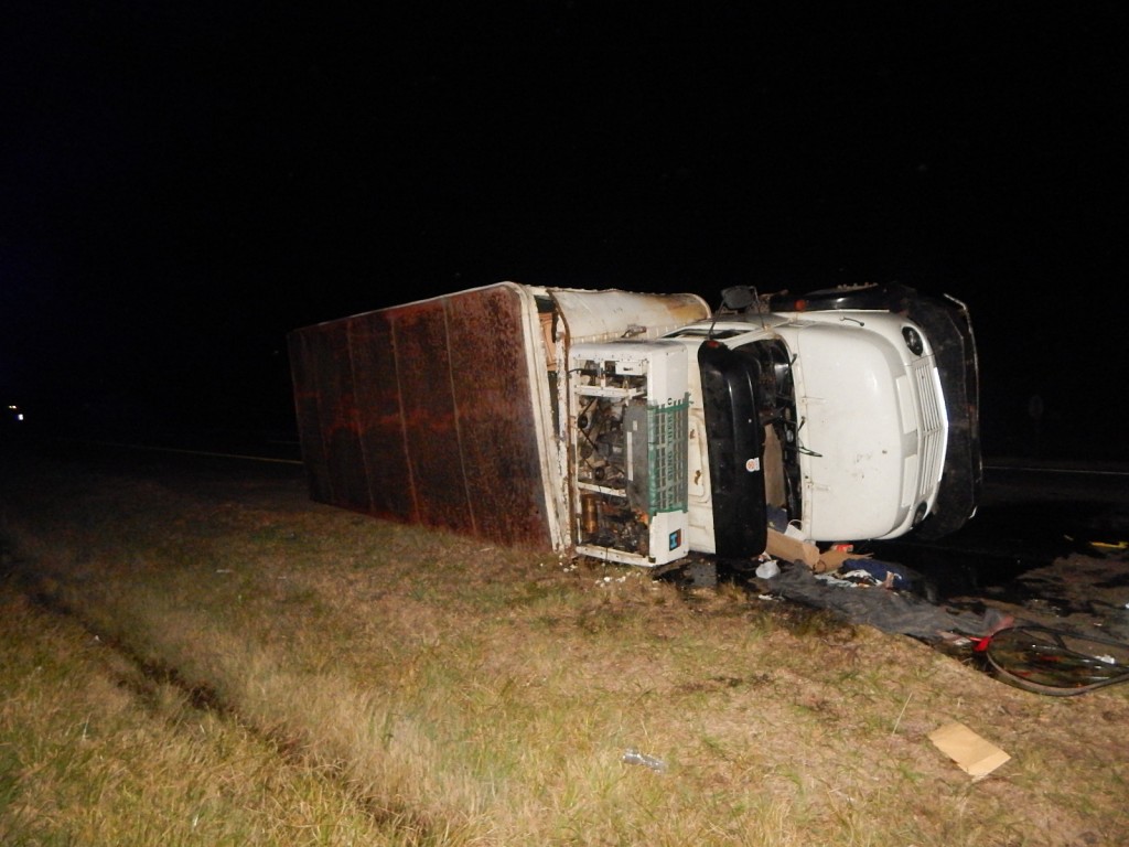 Ayer a la madrugada, un camión Mercedes Benz 1517, conducido por Oscar Fernández de 61 años, domiciliado en Buenos Aires, que circulaba de sur a norte por la Autovía General Artigas, por causa que se tratan de establecer a la altura del Km 247 se cruza a los carriles contrarios y termina volcando sobre una parte de la autovía.