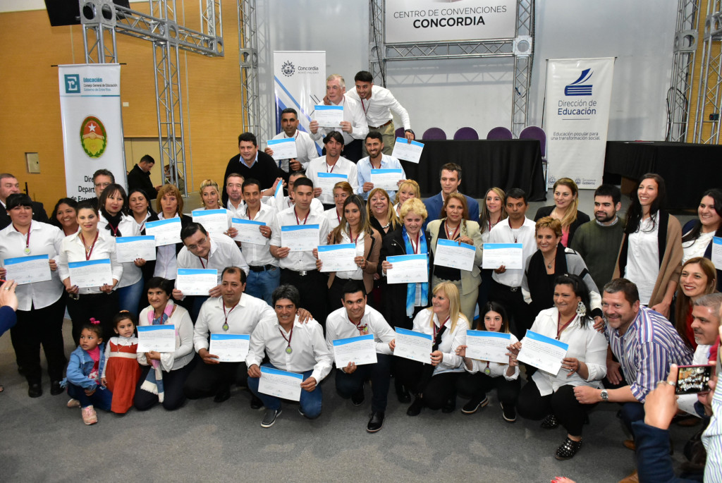 Participaron del emotivo acto realizado este lunes en el Centro de Convenciones junto al jefe comunal, el viceintendente y presidente del Concejo Deliberante Armando Gay, el secretario de Gobierno Alfredo Francolini, la secretaria de Obras Públicas Mireya López Bernis, la directora de Recursos Humanos de la Municipalidad Eugenia Tasino, y Nora Merlo, coordinadora de educación para jóvenes y adultos de la Departamental de Escuelas, entre otras autoridades.