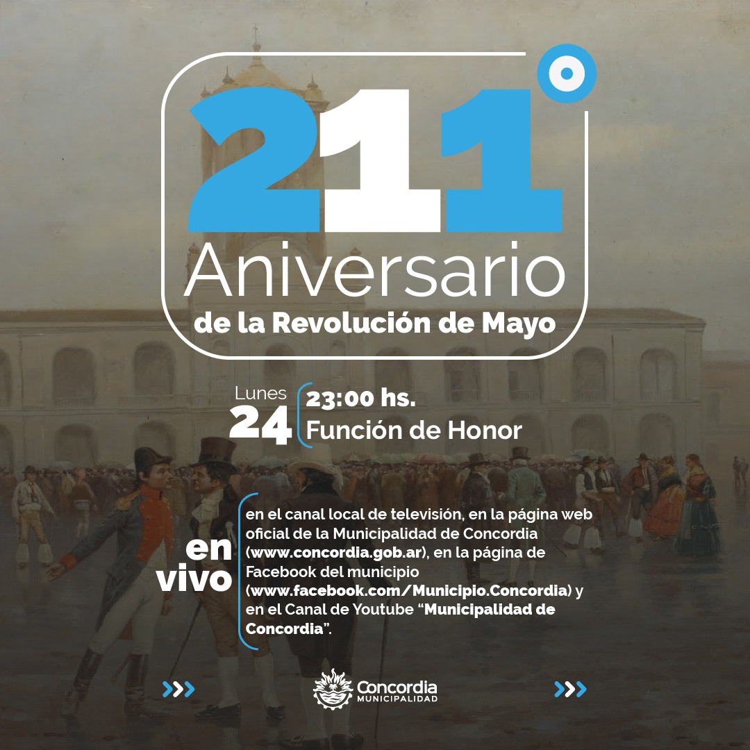VIGILIA CULTURAL VIRTUAL DE LA REVOLUCIÓN DE MAYOLa Municipalidad de Concordia se encuentra preparando una Vigilia Cultural Virtual para recibir el 25 de Mayo y conmemorar el 211° aniversario de la Revolución de Mayo, unidos desde el hogar.